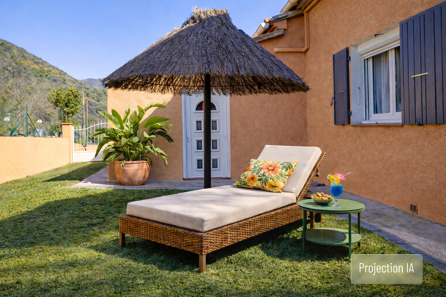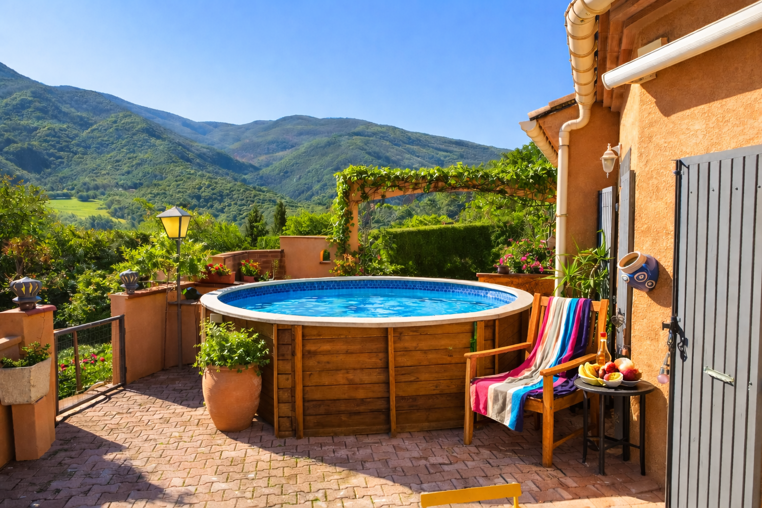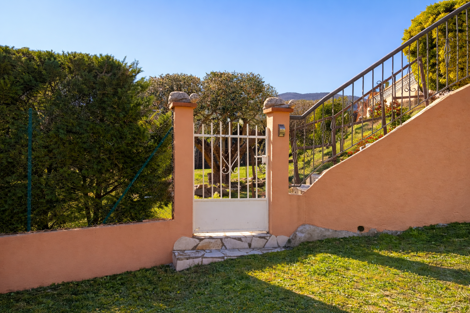 À l’extérieur, le jardin se présente comme un véritable havre de verdure. Les arbres fruitiers abricotiers, pêchers, poiriers et pruniers offrent une abondance gourmande, idéale pour savourer l’art de vivre méditerranéen. L’arrosage est assuré par un canal longeant la propriété, complété par une pompe à eau, garantissant une gestion à la fois pratique et responsable.